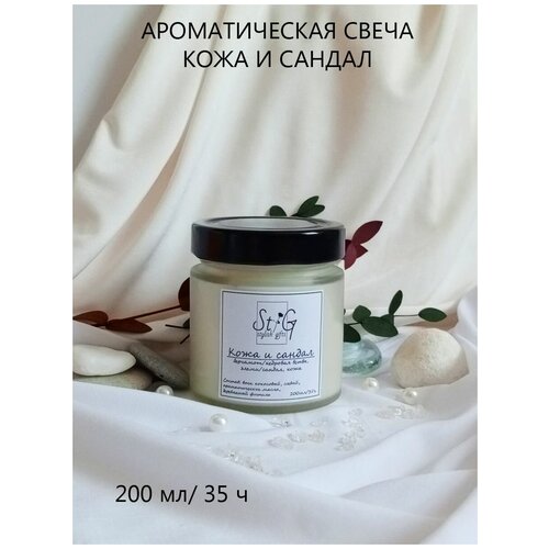 Свеча ароматическая "Кожа и сандал"/Аромасвеча в банке/Деревянный потрескивающий фитиль/35 ч. горения, 200 мл