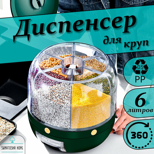 Диспенсер с дозатором для круп и сыпучих продуктов, 6 литров, Зеленый