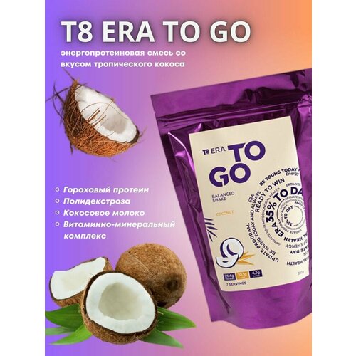 Протеин T8 TO GO кокос. Без лактозы, на кокосовом молоке. Низкоуглеводный. С витаминами. Кето. 350 г.