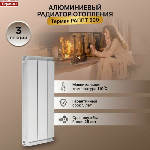 Алюминиевый, секционный радиатор отопления Термал РАППТ-500 3 секции, легкая и тонкая батарея отопления с высокой теплоотдачей и боковым подключением