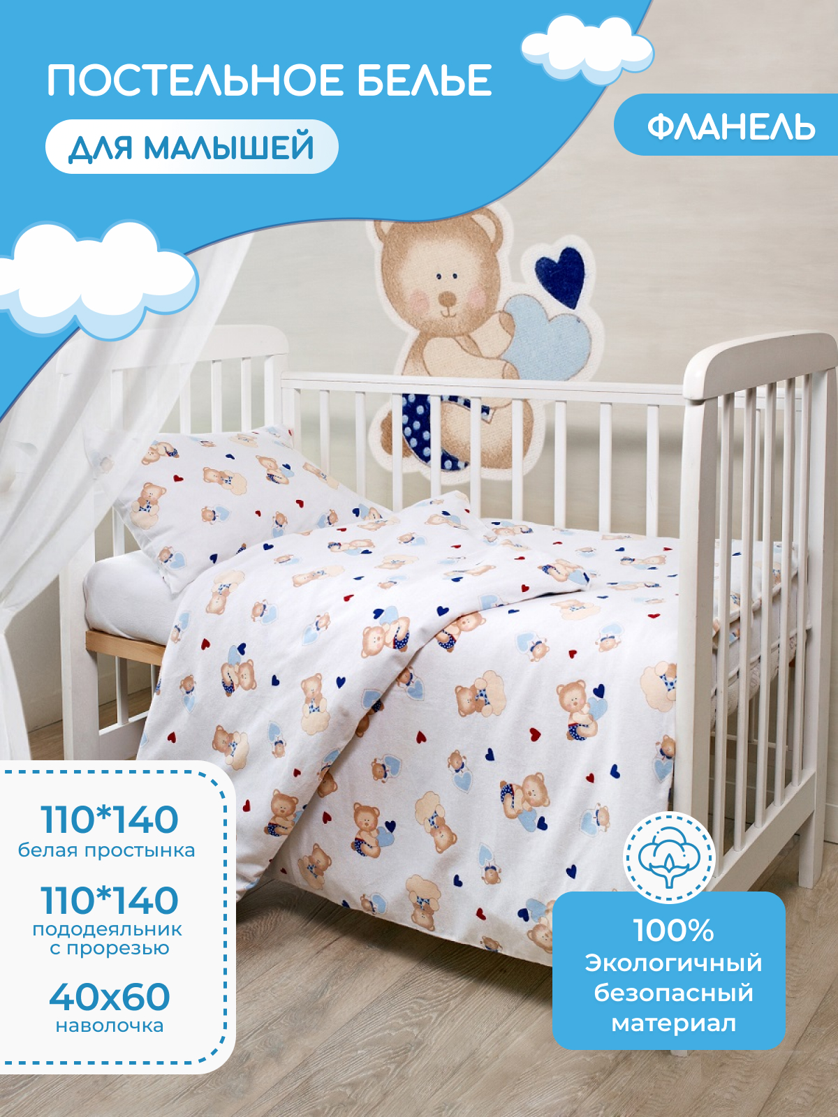 Комплект постельного белья для малышей, фланель / 100% хлопок / Простыня 110х140 / Наволочка 40х60