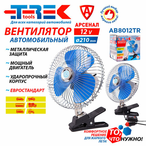 Вентилятор автомобильный с металлической решеткой + прищепка, TREK 8" (210 мм), 12V, AB8012TR