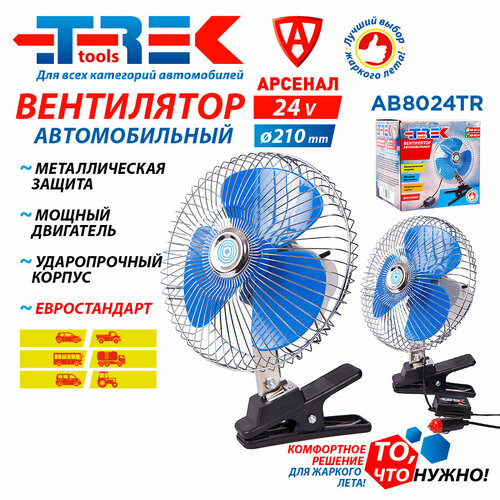 Вентилятор автомобильный с металлической решеткой + прищепка, TREK 8" (210 мм), 24V, AB8024TR