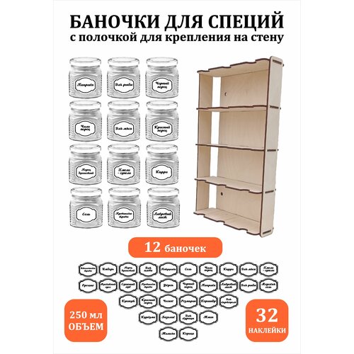 Набор стеклянных баночек для хранения специй с полочкой 12 штук