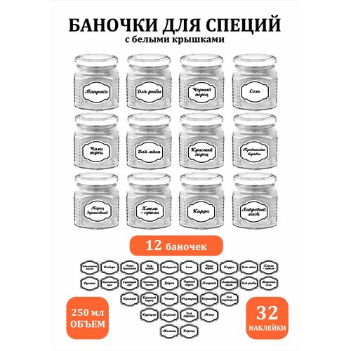 Набор стеклянных баночек для хранения специй с белой крышкой белой этикеткой
