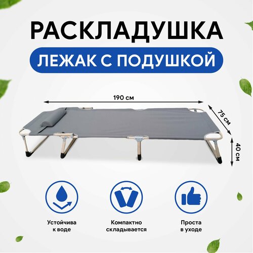 Раскладушка лежак с подушкой, спинка регулируется, размер: 190x75x40 , Кровать раскладушка туристическая, кемпинговая походная кровать