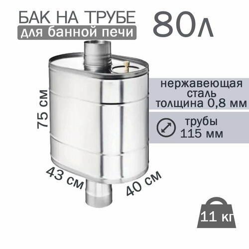 Бак на трубе для печи, 80 л, диаметр 115 мм, AISI 439/0,8 мм, штуцер 3/4"