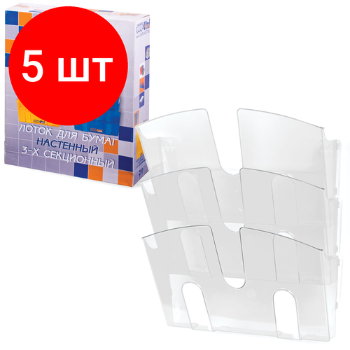 Комплект 5 шт, Подставка настенная для рекламных материалов вертикальная (290х215х32 мм), А4, 3 отделения, прозрачная, 220686