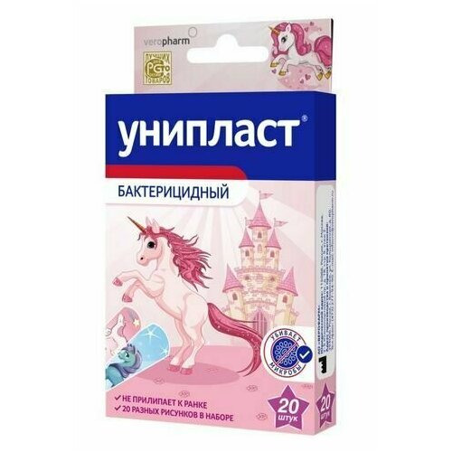 Пластыри бактерицидные влагостойкие детские единороги, размеры 1,6х5,7см/1,9х7,2см, в наборе 20 штук