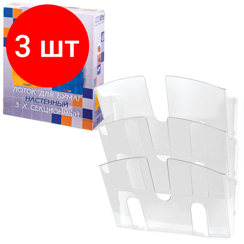 Комплект 3 шт, Подставка настенная для рекламных материалов вертикальная (290х215х32 мм), А4, 3 отделения, прозрачная, 220686