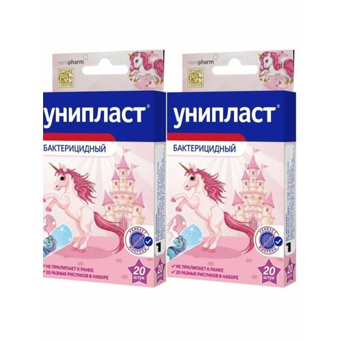 Пластыри бактерицидные влагостойкие детские единороги, размеры 1,6х5,7см/1,9х7,2см, в наборе 20 штук-2 упаковки