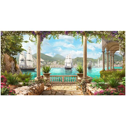 Фотообои Уютная стена "Терраса у моря с парусниками" 520х270 см Виниловые Бесшовные (единым полотном)