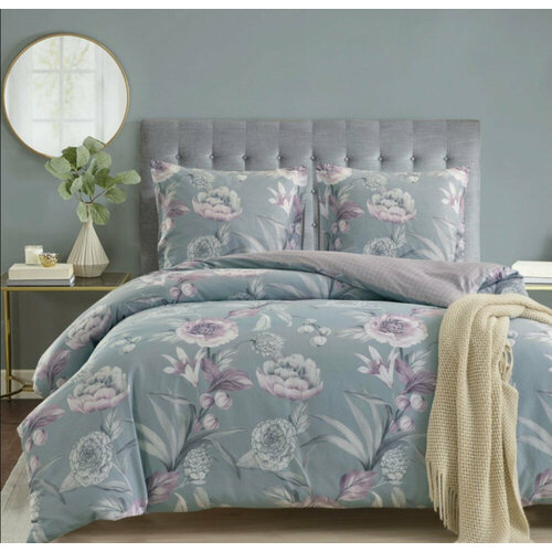1.5 спальное постельное белье сатин двустороннее серо зеленое с цветами