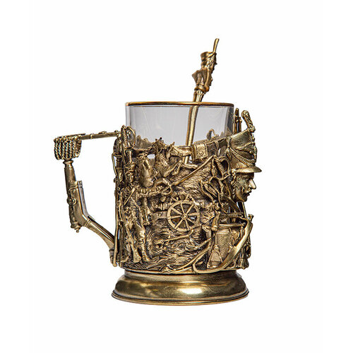 Подстаканник латунный "Гусарский" в наборе со стаканом и ложкой. Художественное литье