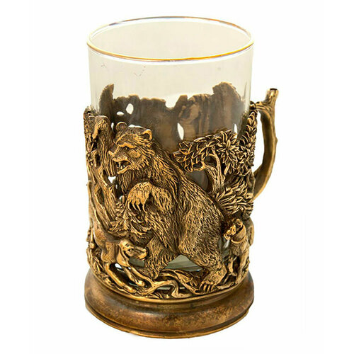 Подстаканник латунный "Охота на медведя" со стаканом, художественное литье