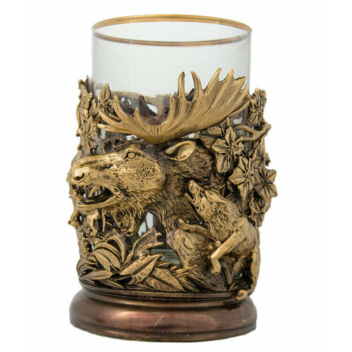 Подстаканник латунный "Охота на лося" со стаканом. Художественное литье