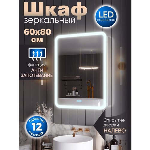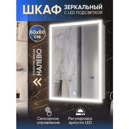 Зеркало шкаф с LED подсветкой "Элегия" 60x80см (холодный свет 6000К, прямоугольное настенное для ванной сенсорное выключение)левое