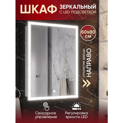 Зеркало шкаф с LED подсветкой "Элегия" 60x80см (холодный свет 6000К, прямоугольное настенное для ванной сенсорное выключение)правое