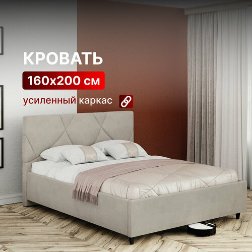 Кровать 160х200 с подъемным механизмом двуспальная Амбер с ортопедическим основанием и ящиком для белья, мягкое изголовье, для спальни и дома, велюр светло-бежевый
