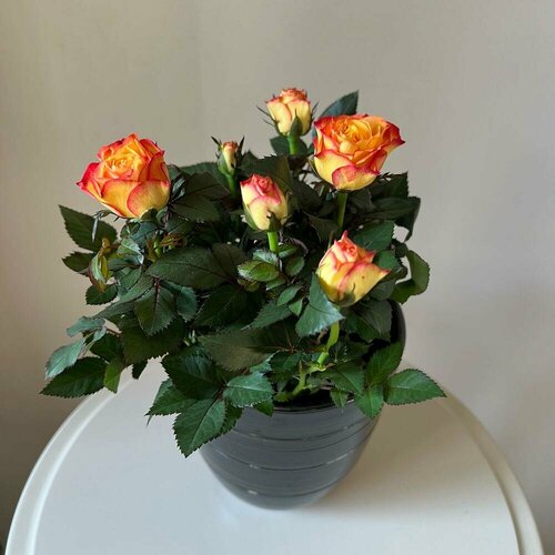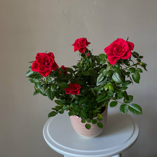 Роза кустовая пышная, цветущая в керамическом кашпо. Размер S