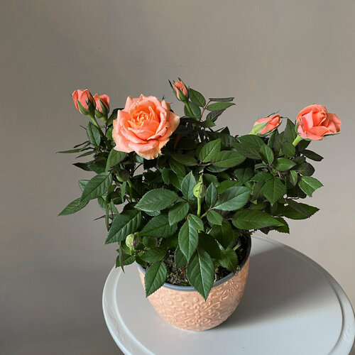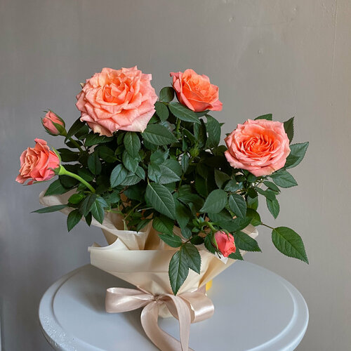 Роза персиковая цветущая в горшке и авторской упаковке. Размер S