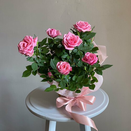 Розовая цветущая роза в горшке в авторской упаковке. Размер S