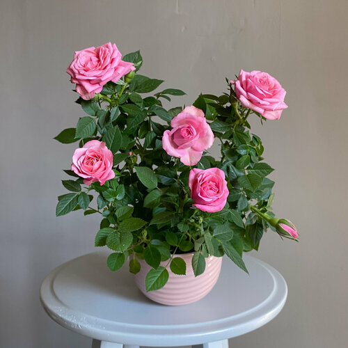 Нежно розовая, пышная, цветущая кустовая роза в горшке и керамическом кашпо. Размер S