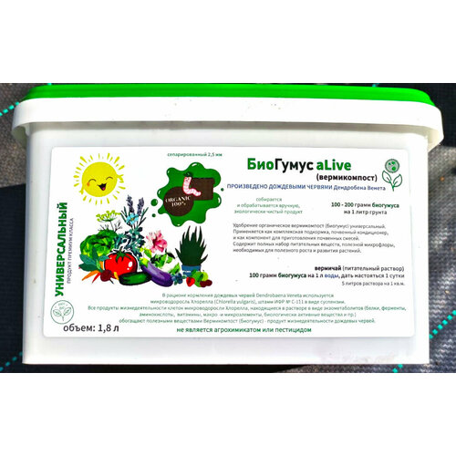 Удобрение органическое Биогумус aLIVE (вермикомпост) универсальное, обогащенное микроводорослью Хлорелла, пласт. контейнер, объем 1,8 л