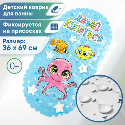 Детский коврик для ванны на присосках противоскользящий "весёлое купание" 36х69 см. голубой для мальчиков