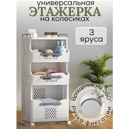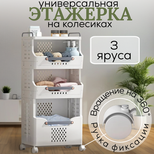 Этажерка складная на колесиках пластиковая для ванной комнаты и кухни