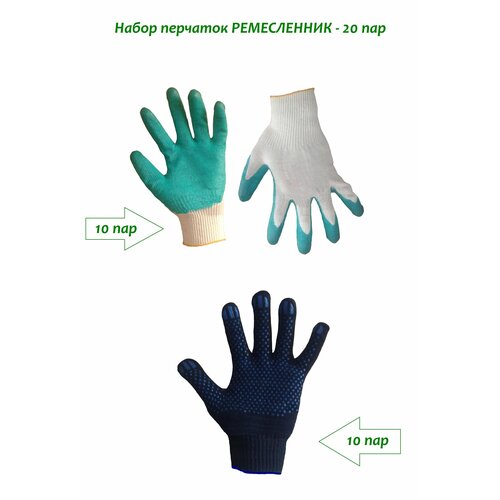 Перчатки рабочие, строительные, набор "Ремесленник" (Перчатки Х/Б с одинарным обливом - 10 пар, Перчатки Х/Б с ПВХ, 4 нити, 10 класс - 10 пар)