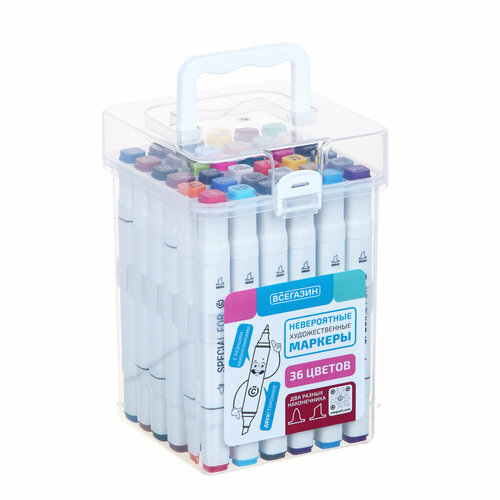 Всёгазин Набор маркеров худож, 36 цветов, 2-сторонний (скошенный 6мм + круглый 2мм), в пласт. боксе