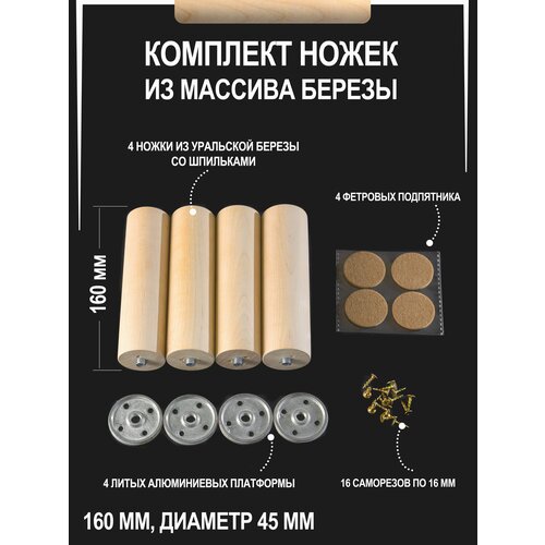 Мебельные деревянные ножки 4 шт, 15 см, берёза, черная опора WOODGRI