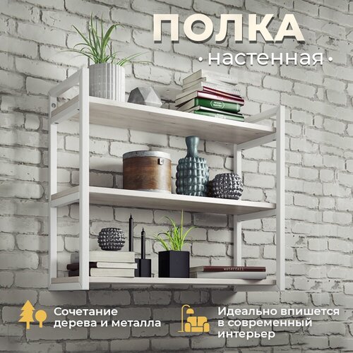 Настенная, книжная полка тройная лофт 69х24х57,8 см белая, с комплектом крепежа, для цветов и книг