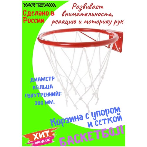 Корзина баскетбольная, баскетбольное кольцо, металлическое, с упором, с сеткой, диаметр 38 см.