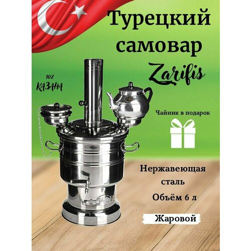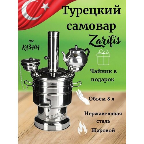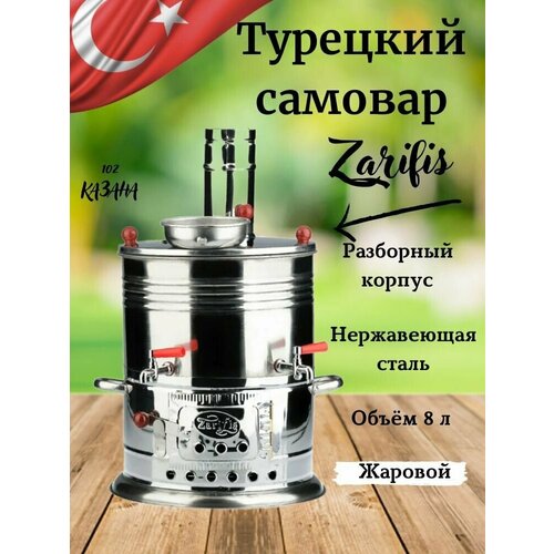 Самовар Турецкий 8 литров жаровой (дрова, уголь, шишки) Zarifis S-116 + заварочный чайник в подарок, съёмная крышка, нержавеющая сталь