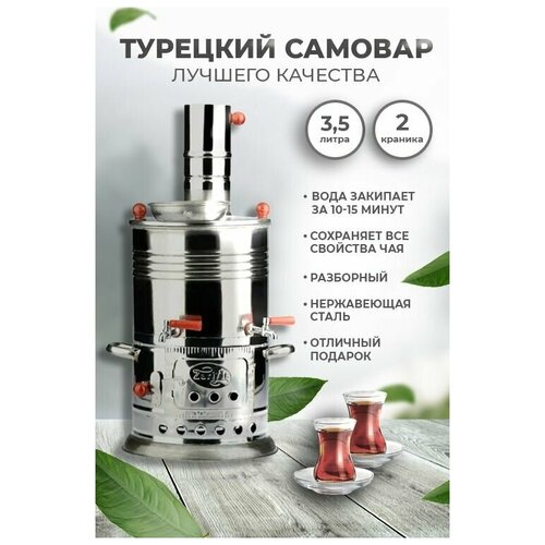 Самовар Турецкий на дровах два крана 3,5 литра Zarifis S-103, нержавеющая сталь