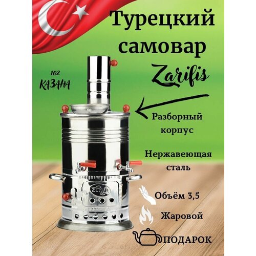 Самовар Турецкий 3,5 литра жаровой (дрова, уголь, шишки) Zarifis S-101, съёмная крышка, нержавеющая сталь + заварочный чайник