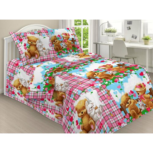 Постельное белье 1,5-спальное поплин пл. 115 гр/м2. Мишки, зайки роз. (Полутораспальный / 143х215 / 145х214 / 70х70)