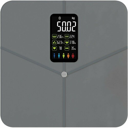Тип устройства весы. Тип весов электронные. Диагностические да. Точность измерения 100 г. Дополнительные функции определение доли воды, определение доли жировой ткани, определение доли костной ткани, определение доли мышечной ткани, расчет ИМТ (BMI). Синхронизация со смартфоном есть. Единицы измерения кг. Тип элементов питания AAA. Материал платформы стекло. Ширина 28 см. Высота 2.5 см. Протокол связи Bluetooth. Цвет серый.