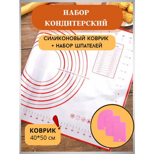 Набор кондитерский силиконовый коврик для выпечки, для запекания, для раскатки теста (размер 40*50) и набор шпателей (розовый)