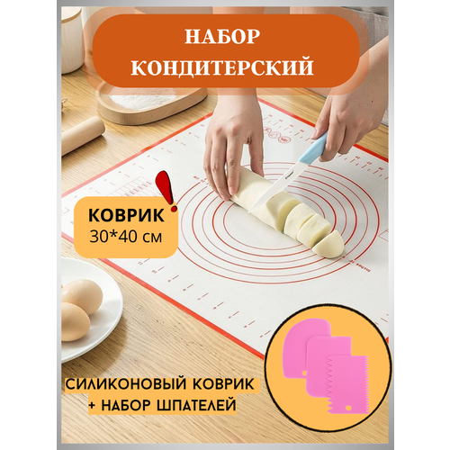 Набор кондитерский силиконовый коврик для выпечки, для запекания, для раскатки теста (размер 30*40) и набор шпателей (розовый)