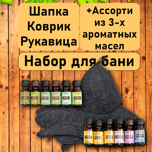 Набор для бани. Черный. Шапка+коврик+рукавица+масло 3шт ассорти