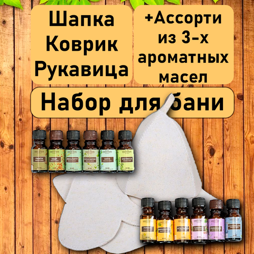 Набор для бани. Белый. Шапка+коврик+рукавица+масло 3шт ассорти