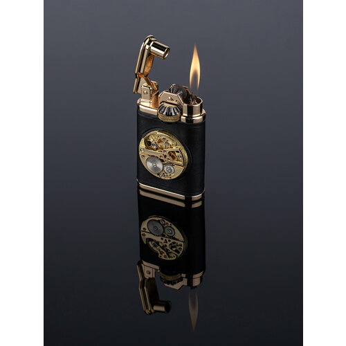 Chief зажигалка бензиновая с декоративным скелетонным механизмом, подарочная, черная кожа/золотистый