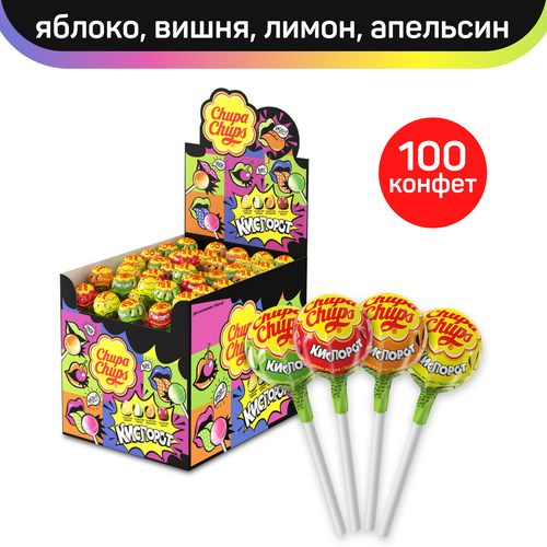 Карамель Chupa Chups Кислорот со вкусами яблока, вишни, лимона, апельсина, 100 шт по 12 гр.