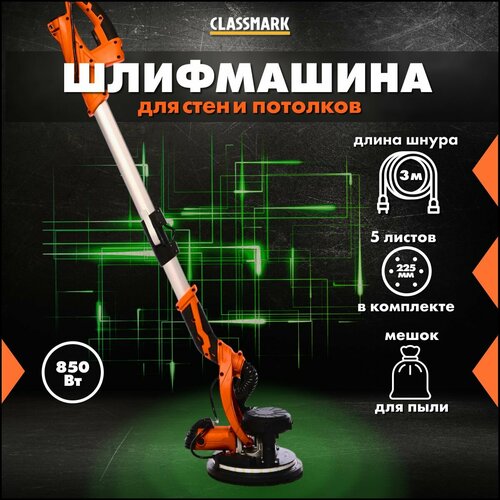 Шлифовальная машина для стен и потолков жираф Classmark 1640, мощность 850 Вт, 1900 об/мин регулировка оборотов, плавный пуск, мешок пылесборник и 5 шлифовальных листов в комплекте по 225мм