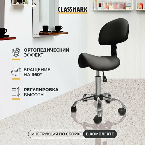 Стул седло мастера на колесиках со спинкой Classmark кресло c регулировкой высоты ортопедическое, максимальная нагрузка 150 кг, сталь и пластик, ПВХ, Экокожа - черный