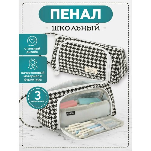Пенал для девочек и мальчиков 3 отдела на молнии для школы, черно-белые ромбы