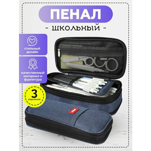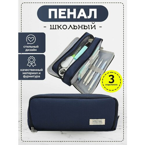 Пенал для девочек и мальчиков 3 отдела на молнии для школы, темно-синий